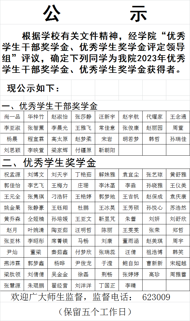 根据学校有关文件精神,经学院“优秀学生干部奖学金、优秀学生奖学金评定领导组”评议,确定下列同学为万象城2023年优秀学生干部奖学金、优秀学生奖学金获得者。 现公示如下:
