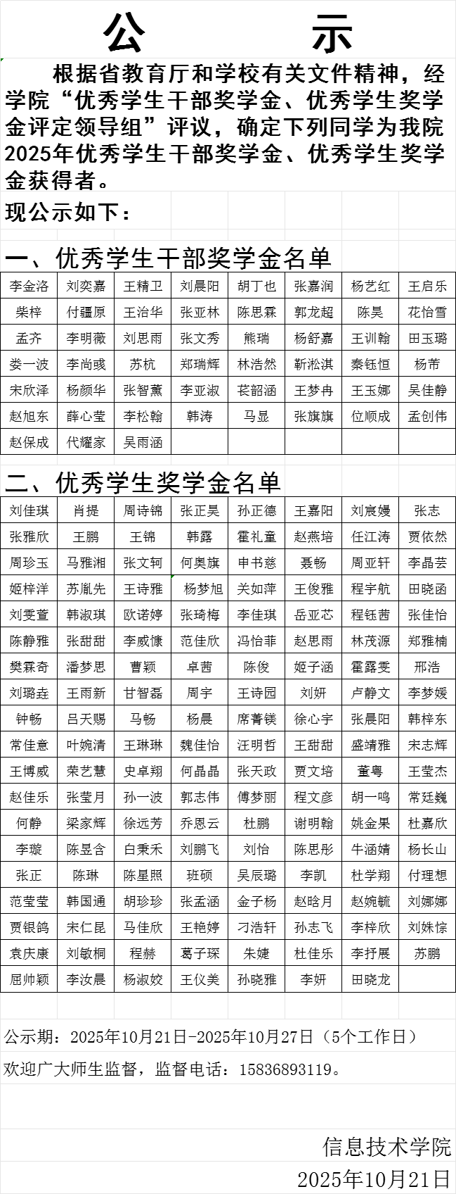 万象城娱乐awc线路2025年优秀学生干部奖学金、优秀学生奖学金评选结果公示