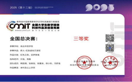 近日,2025年(第十三届)全国大学生数字媒体科技作品及创意竞赛全国总决赛结果揭晓,万象城翎创游戏研发社团学生团队凭借作品《薪火·红韵虚拟沉浸馆》,从众多参赛作品中脱颖而出,荣获全国总决赛三等奖。