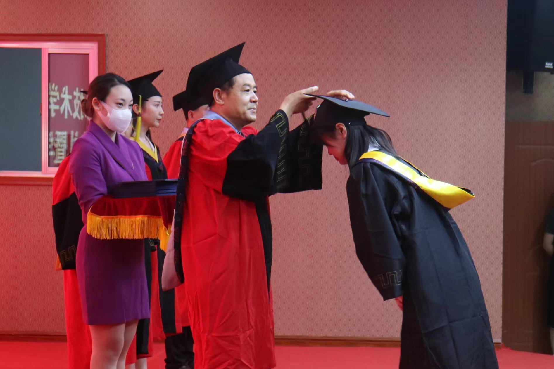 学位授予仪式上,辛作义副校长为毕业生扶正流苏并颁发学位证书。
