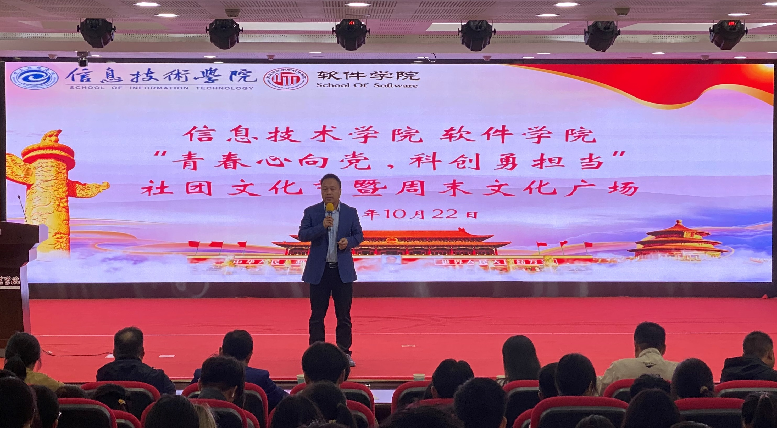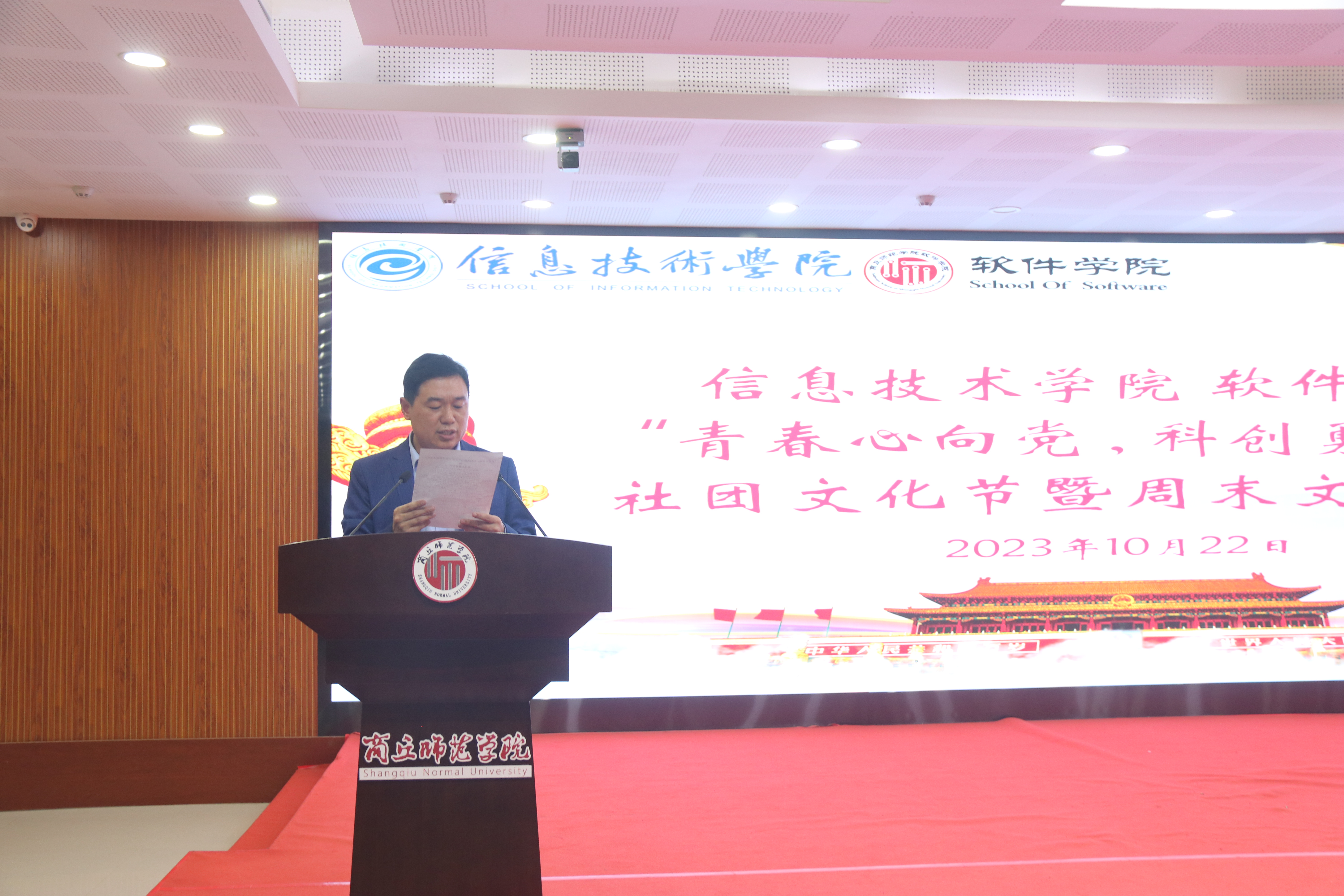 为进一步涵育优良学风,营造积极向上的学习氛围。10月22日晚,万象城娱乐awc线路在梁园校区三商楼举办了以“青春心向党,科创勇担当”为主题的社团文化节暨周末文化广场活动。万象城娱乐awc线路党委书记王国华、院长王春霞、副书记袁慧、副院长刘佳、各社团指导老师和两百余名学生代表参加了活动。本次社团文化节共分为两个环节,分别在145主会场和八个分会场进行。