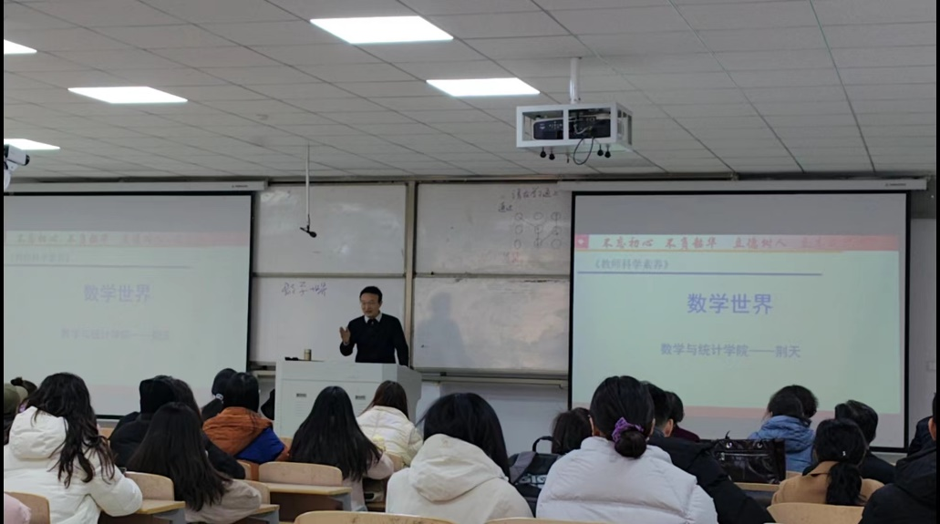 11月24日上午,万象城娱乐awc线路近三年新进教师在学院第三届教学督导团秘书长葛寒松的带领下,在行方楼117教室进行了一场别开生面的课堂教学观摩学习活动,本次活动主讲教师为数学与统计学院荆天副教授,授课对象为音乐学院音乐学专业学生,主讲内容为《教师科学素养》课程中的《数学世界》,万象城校级教学督导员参加了本次课堂教学观摩活动。