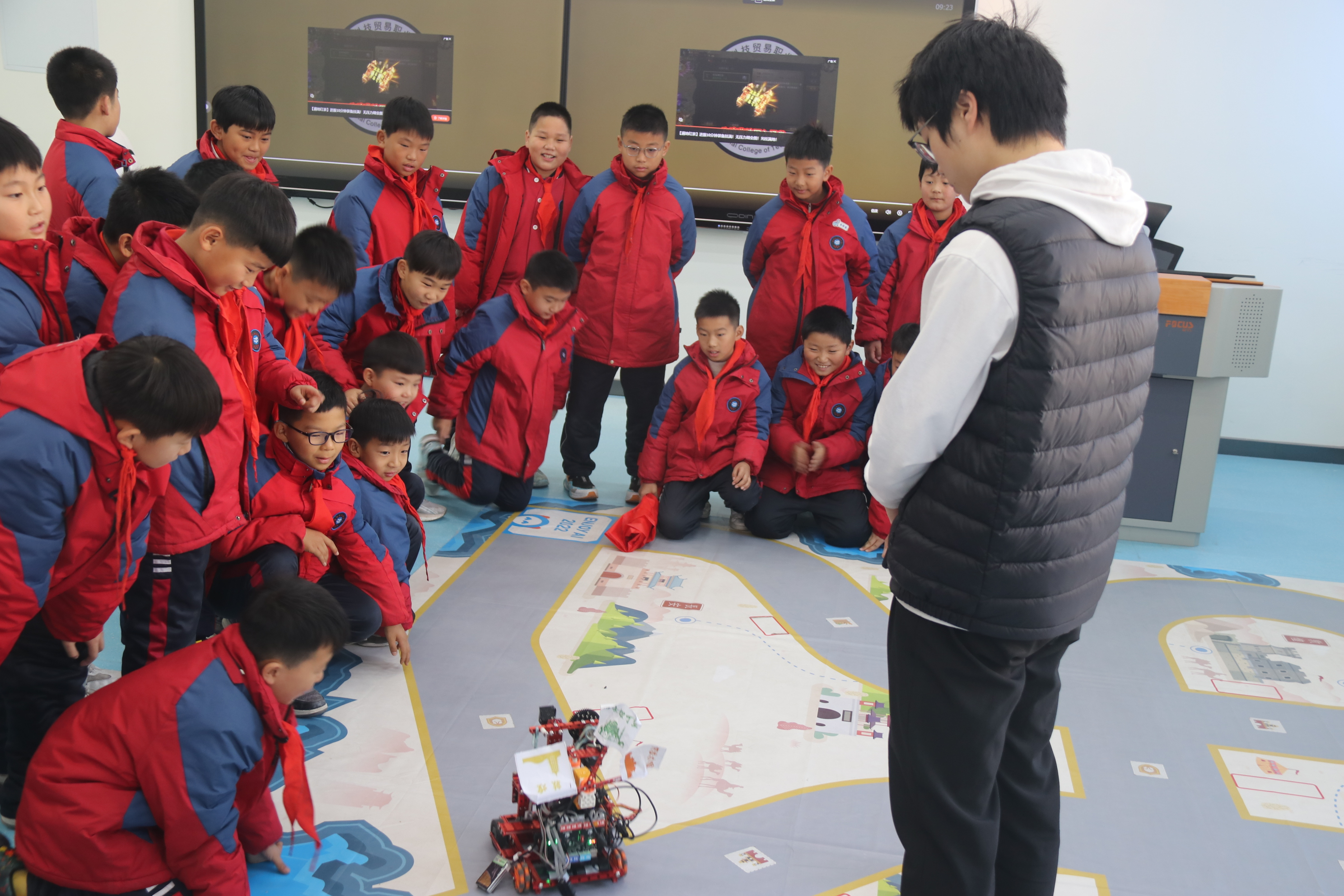 揭牌仪式后,该校学生在学院志愿者带领下开展科技社团研学活动,分别参观了人工智能教学实训中心、无人机应用中心、虚拟现实实训室等实验室,每个实验室都为参观人员安排了大学生志愿者进行知识讲解。小朋友们在参观过程中积极主动体验人工智能、VR等信息技术,现场氛围轻松有趣。