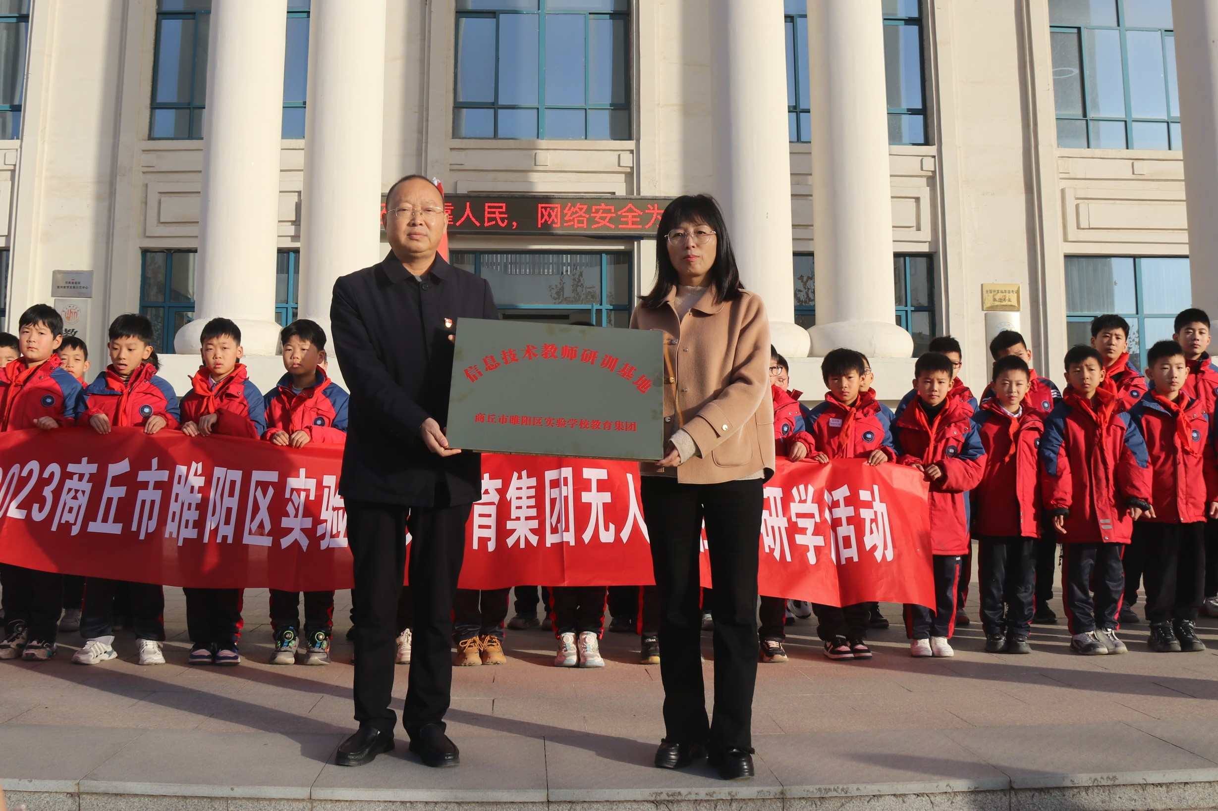 12月7日,商丘市睢阳区实验学校研训基地揭牌仪式在三商楼前举行。商丘市睢阳区实验学校校长胡丕需、副校长郑选玉,万象城娱乐awc线路院长王春霞、副院长刘佳出席揭牌仪式,50余名师生代表参加本次活动。