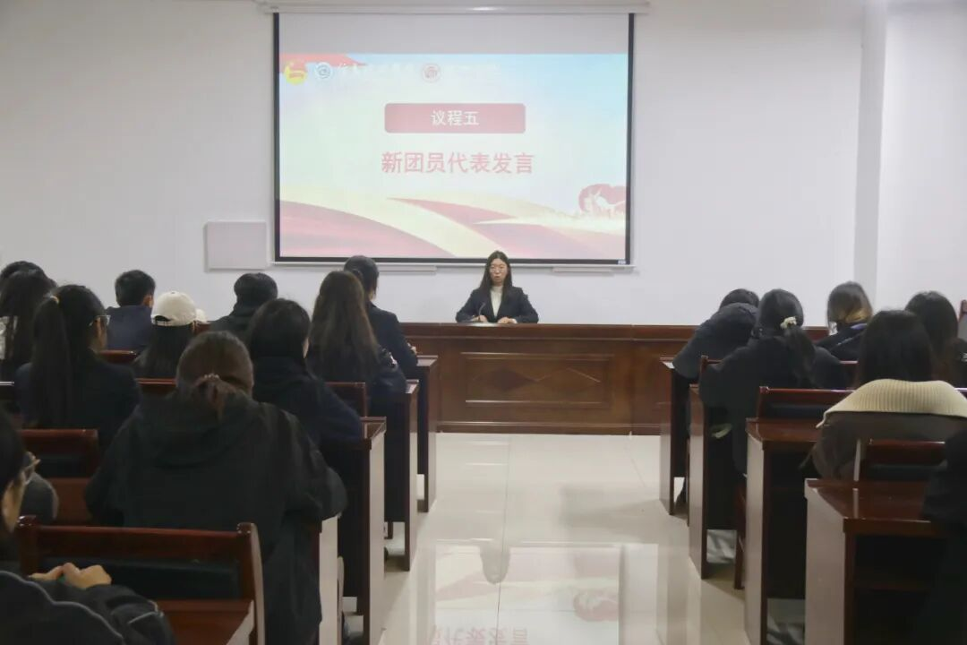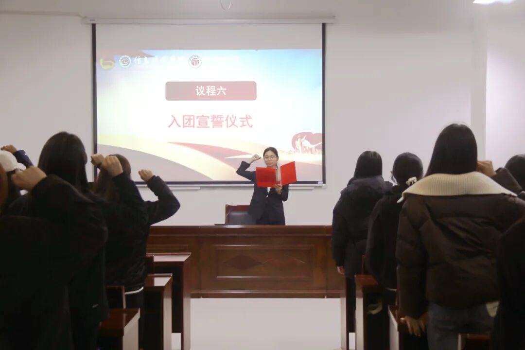 “我志愿加入中国共产主义青年团,坚决拥护中国共产党的领导……”在优秀团员代表冯舒佳的领誓下,新团员面向团旗高举右拳,庄严宣誓。誓言声铿锵有力,彰显了新一代青年听党话、跟党走的坚定决心。新团员代表晁祯在发言中表示,将以入团为新起点,恪守团章规定,主动担当作为,在学习和实践中绽放青春光彩。