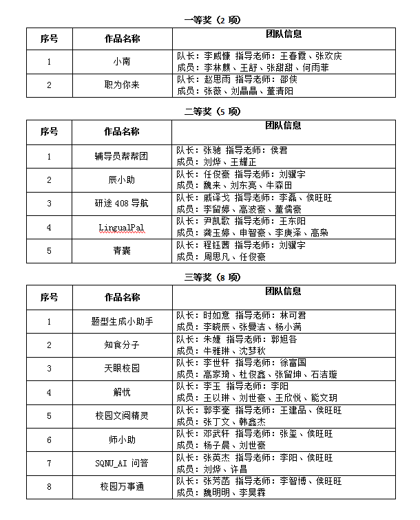 本次大赛旨在激发学生对人工智能技术的探索热情,锤炼创新思维与团队协作能力,鼓励学子将 AI 技术与校园学习、生活场景深度融合,探索智能技术赋能教育的多元路径。经过多轮激烈角逐与专家评审团的严格评定,最终评选出一等奖 2 项、二等奖 5 项、三等奖 8 项。