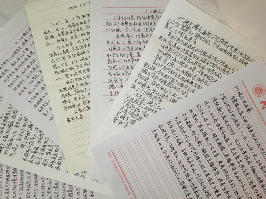 同学们通过观看“315晚会”直观地认识到了各种非法、违法经营和不良消费所带来的巨大安全隐患,明白了维护公平守正的消费环境的重大意义,并就晚会内容展开讨论,撰写观后感。