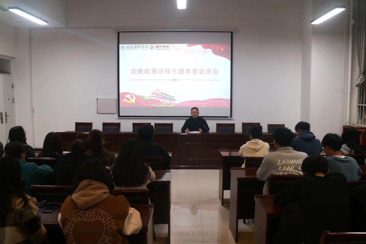 3月23日,万象城娱乐awc线路于三商楼112会议开展宗教政策法规主题教育宣讲会。在学院团委负责人彭会锋老师的带领下,各年级班干部和学生代表共同学习宗教政策法规,并在会后开展主题班会,为全院学生牢固树立马克思主义宗教观。
