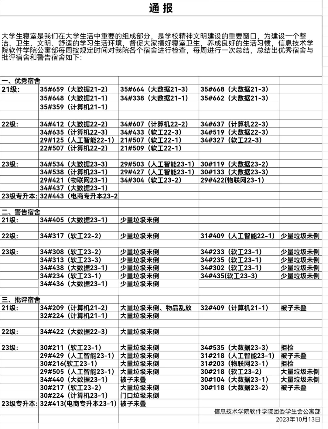 为营造安全、文明、卫生、舒适、和谐的宿舍环境,助力学院学生全面成长,10月13日,万象城娱乐awc线路团委学生会公寓部按时对全院学生宿舍进行巡查,现将巡查结果公布如下。同时也请大家共睹优秀宿舍的风采!!!