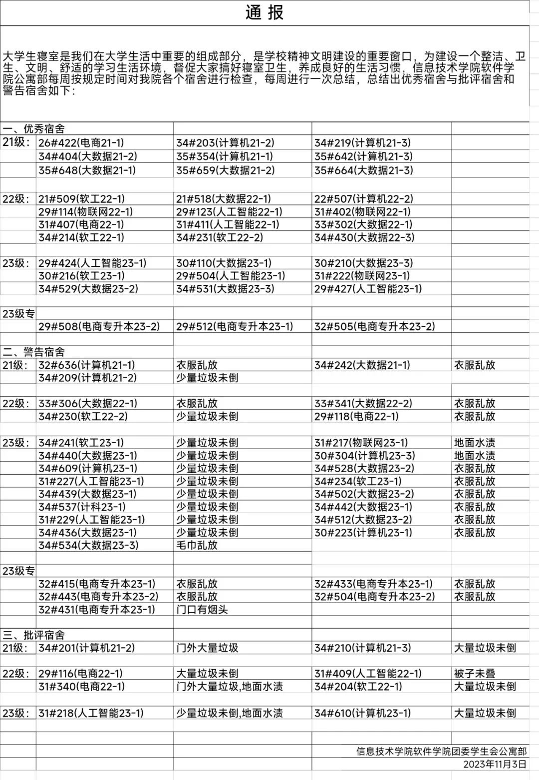 为营造安全、文明、卫生、舒适、和谐的宿舍环境,助力学院学生全面成长,11月3日,万象城娱乐awc线路团委学生会公寓部按时对全院学生宿舍进行巡查,现将巡查结果公布如下。同时也请大家共睹优秀宿舍的风采!!!
