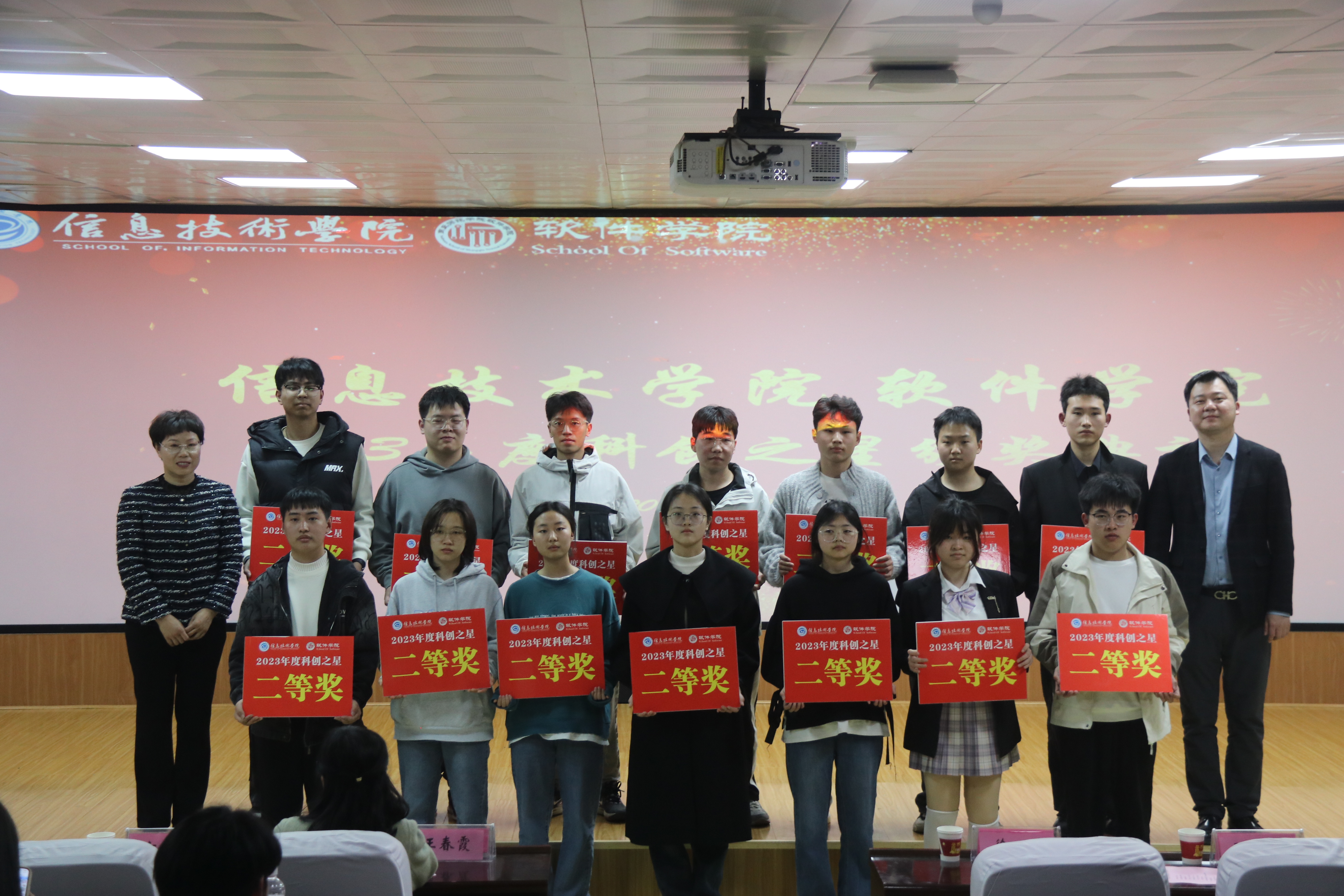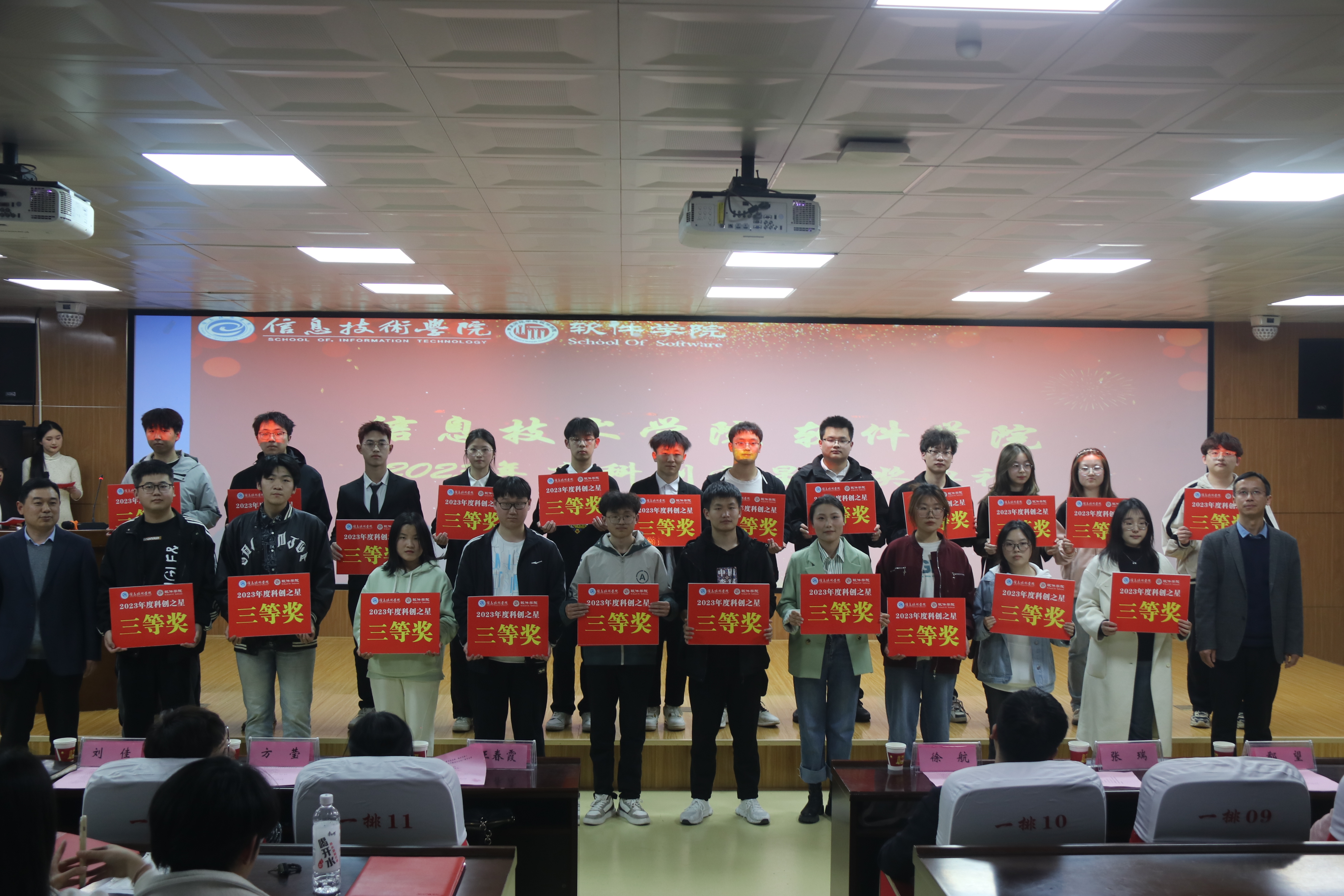最后,由万象城娱乐awc线路副院长刘佳宣读万象城娱乐awc线路2023年度科创之星获奖名单,并由各位领导老师依次为获奖的同学颁奖,希望同学们再接再厉,锐意进取,勇攀科技高峰,争做时代新人。