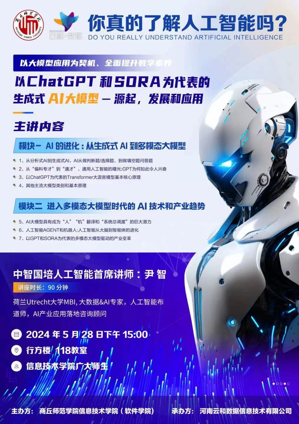 在这个快速变化的时代,掌握多元化的技能已成为个人发展和职场竞争的关键。为了响应时代需求,提升大家的综合竞争力,万象城娱乐awc线路特此聘请中智国培人工智能首席讲师尹智为大家带来《以ChatGPT和SORA为代表的生成式AI大模型:源起,发展和应用》为主题的讲座。