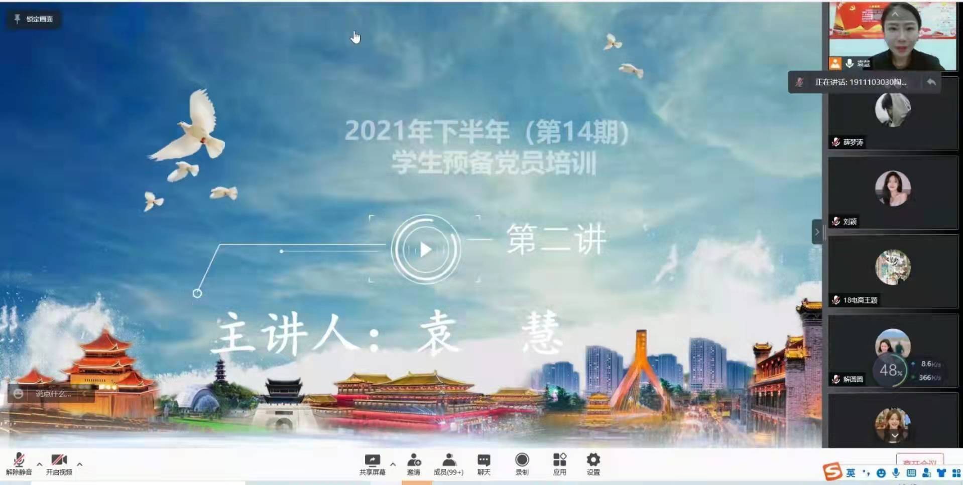 为深入开展党史学习教育,带领学生更好地学习党的光辉历程,增强同学们肩负时代重任的责任感。2021年12月5日,万象城娱乐awc线路党委副书记袁慧为2021年下半年第十四期预备党员开展线上党课培训。