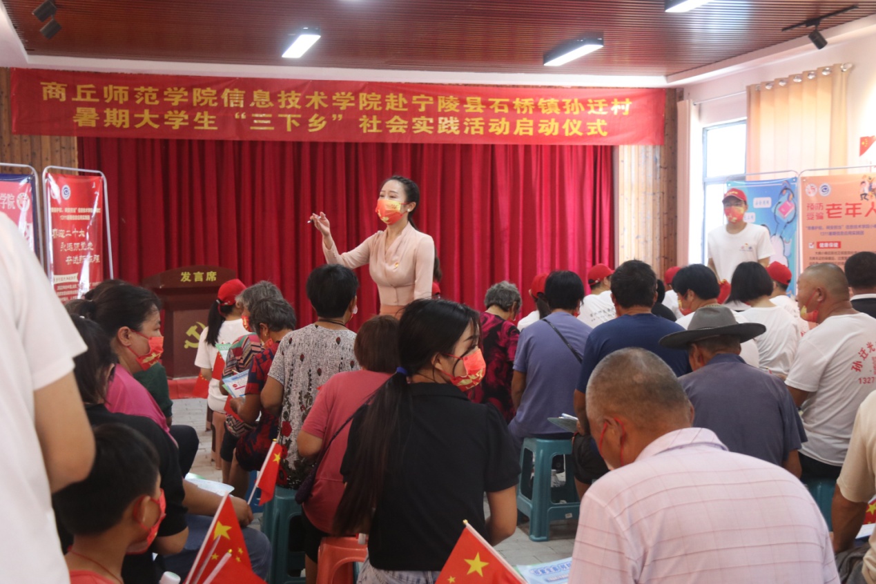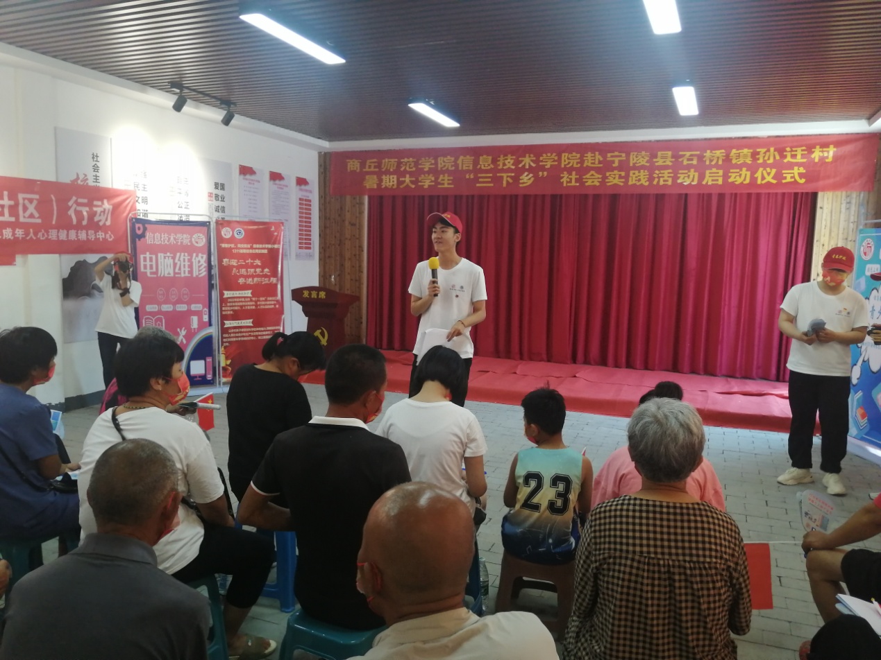 7月21日,万象城娱乐awc线路赴宁陵县石桥镇孙迁村开展暑期大学生“三下乡”实践活动。宁陵县委宣传部副部长臧峰,宁陵县团委书记李鹏,石桥镇镇长吕海涛,万象城娱乐awc线路团委书记刘培培,副书记徐航,万象城娱乐awc线路党委书记王国华,副书记袁慧及十余名学生志愿者参加了此次活动。启动仪式由王国华主持。