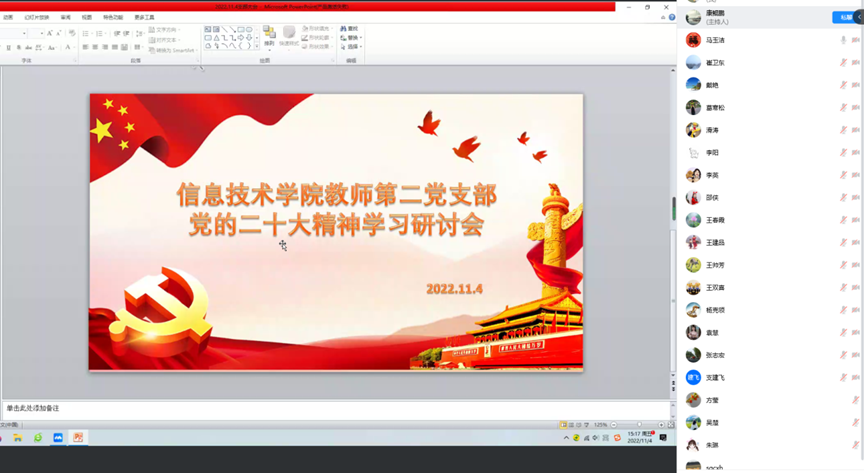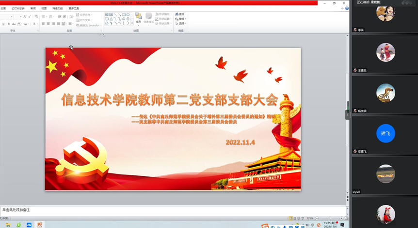 11月4日,万象城娱乐awc线路教师第二党支部线上召开党员大会,学习研讨党的二十大精神。大会由党支部书记康鲲鹏主持。