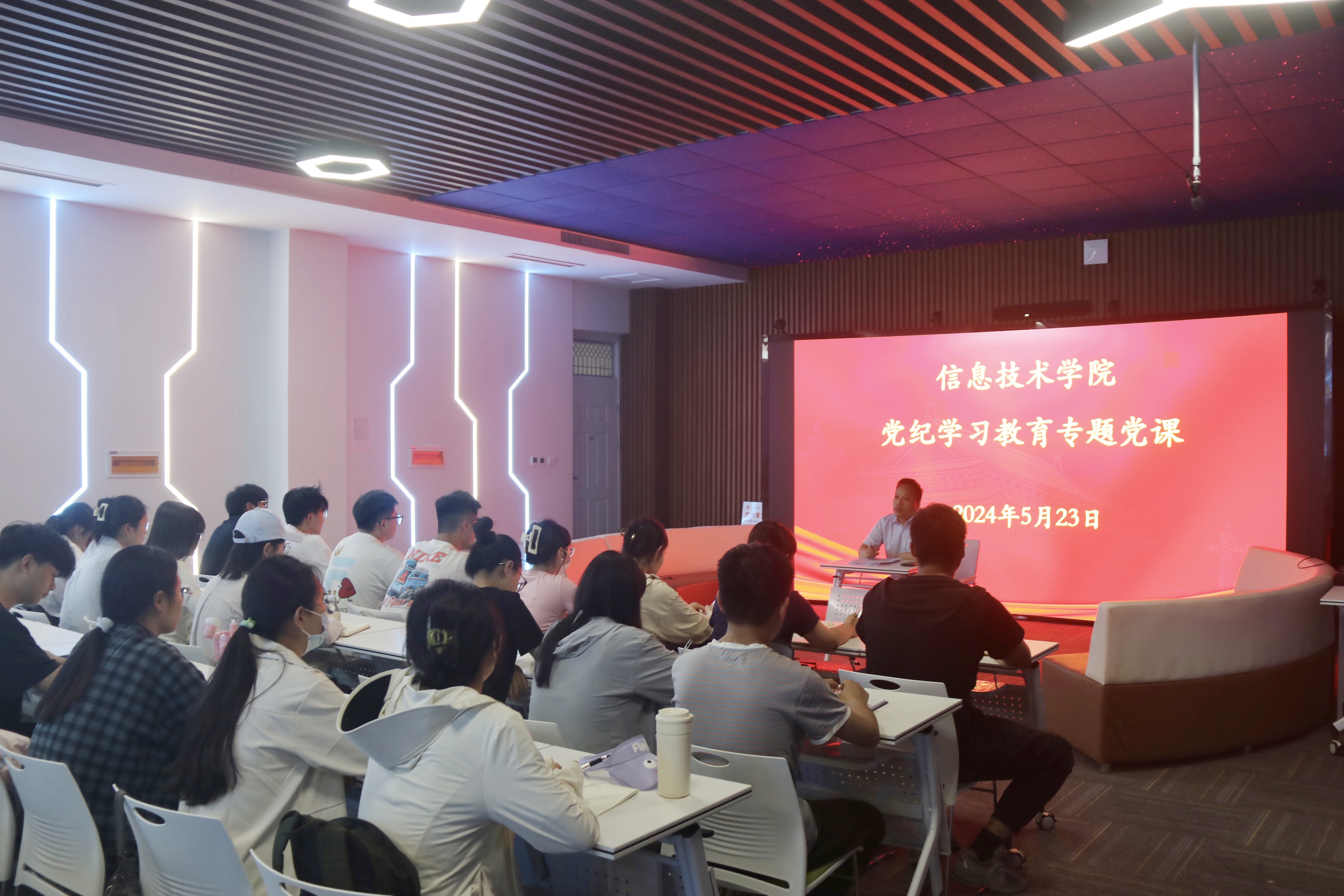 5月23日,万象城娱乐awc线路于三商楼322VR党建活动室举办党纪学习教育专题党课,万象城娱乐awc线路党委书记王国华主讲,学院全体党员参加。