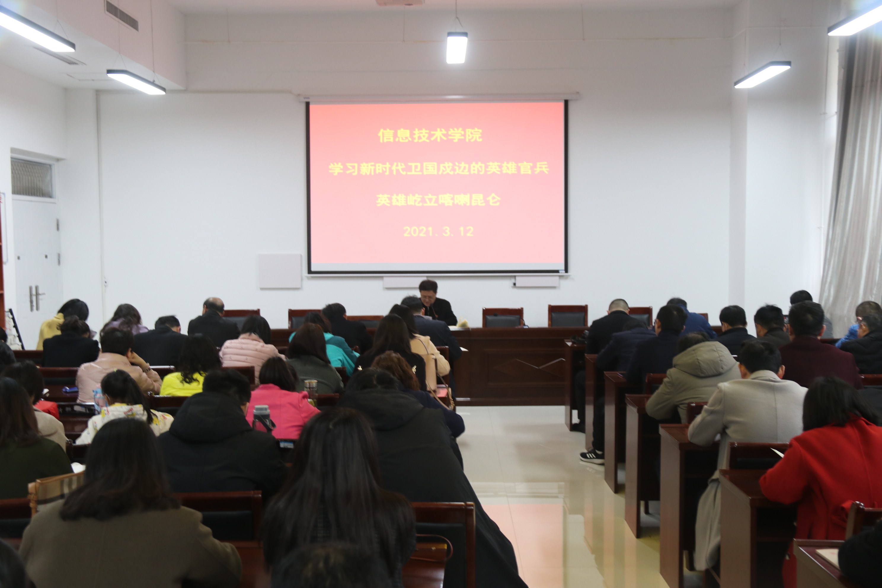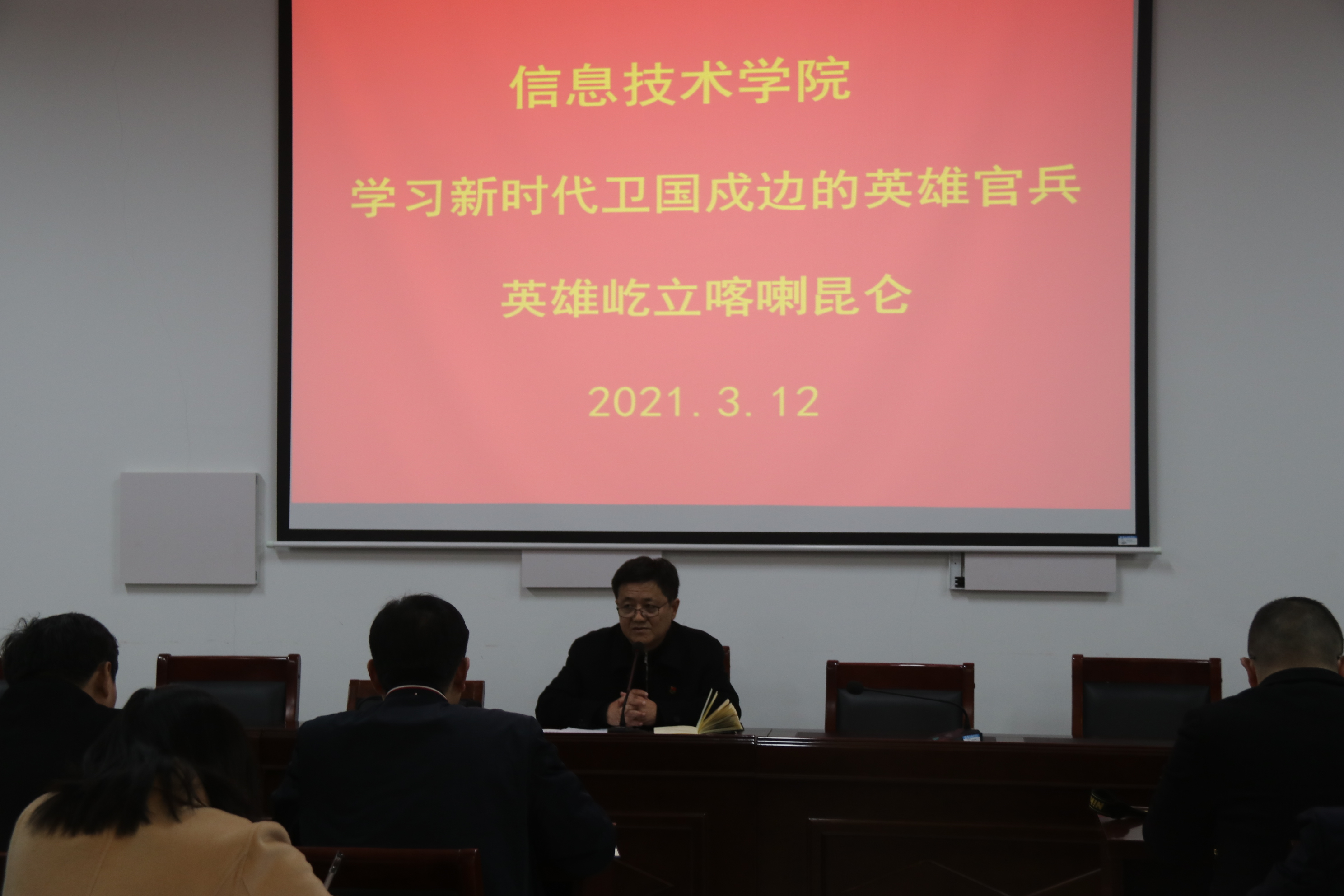 为了纪念卫国戍边英雄官兵,学习英雄们的爱国精神。312日,万象城娱乐awc线路于三商楼112会议室举行学习卫国戍边英雄官兵事迹会议。会议由党总支书记张辉主持,万象城娱乐awc线路全体教职工参加了此次会议。