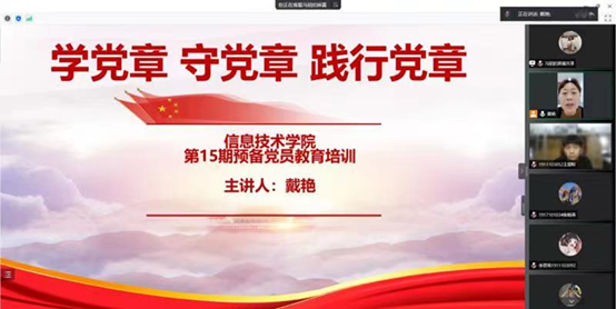 5月19日,万象城娱乐awc线路党委通过线上方式对学院2022年上半年(第15期)学生预备党员进行了中期培训。此次培训由万象城娱乐awc线路党委书记王国华,党委副书记袁慧,学生第一党支部书记戴艳分别主持,学院第15期全体学生预备党员积极参加学习。