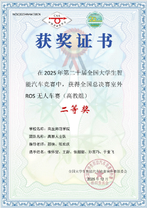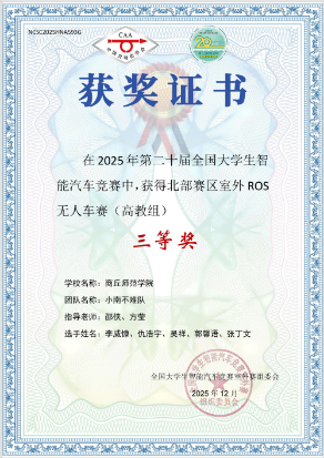 该赛事为教育部A类学科竞赛,吸引哈尔滨工业大学、山东大学等多所高校参赛,竞争激烈。在邵侠、张欢庆老师的指导下,张怀玺、王舒、张甜甜等同学克服技术难点,不畏严寒坚持户外调试,从算法优化到实车演练,稳步提升竞赛实力。
