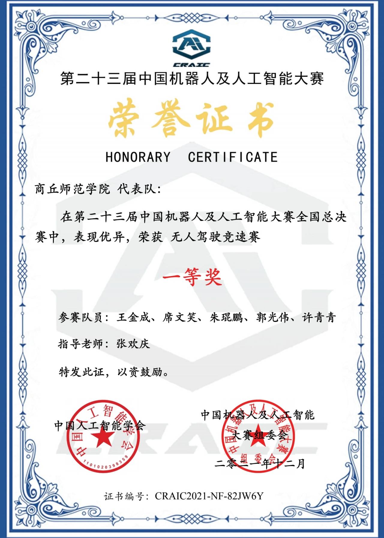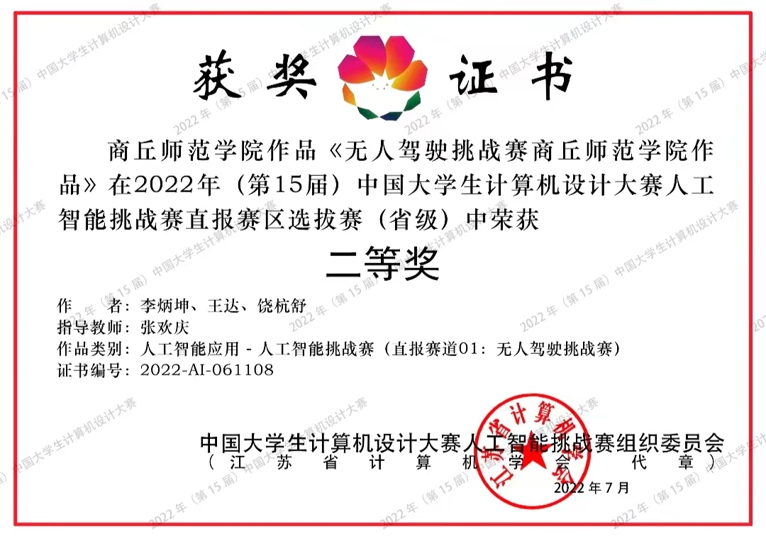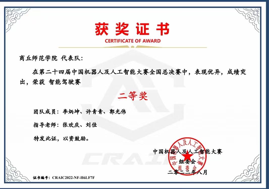 2022年8月,由中国人工智能学会举办的第二十四届中国机器人及人工智能大赛落下帷幕,万象城娱乐awc线路许青青等三名学生通过层层选拔,在此次角逐中荣获智能驾驶赛国赛二等奖。