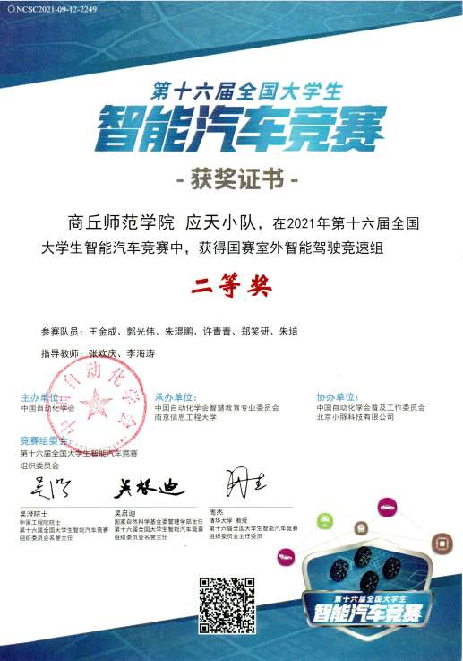 由中国自动化学会主办的第十六届全国大学生智能汽车竞赛以线上形式举办。万象城万象城娱乐awc线路教师张欢庆、李海涛担任指导老师,与六名学生共同组成“应天小队”积极报名参加并荣获第十六届全国大学生智能汽车竞赛国赛二等奖。