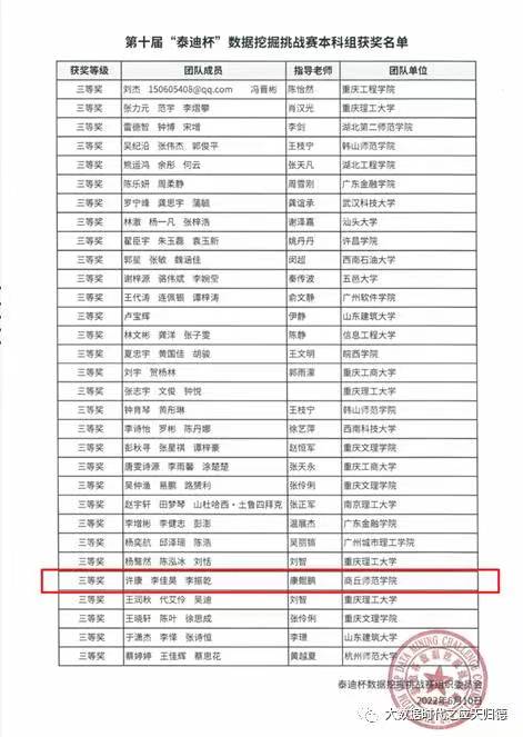 2022年6月,第十届“泰迪杯”数据挖掘挑战赛落下帷幕,获奖名单相继公示。万象城娱乐awc线路大数据专业共派出3支学生队伍参赛,最终荣获本科组全国二等奖1个,全国三等奖1个,省级一等奖1个,省级二等奖1个。