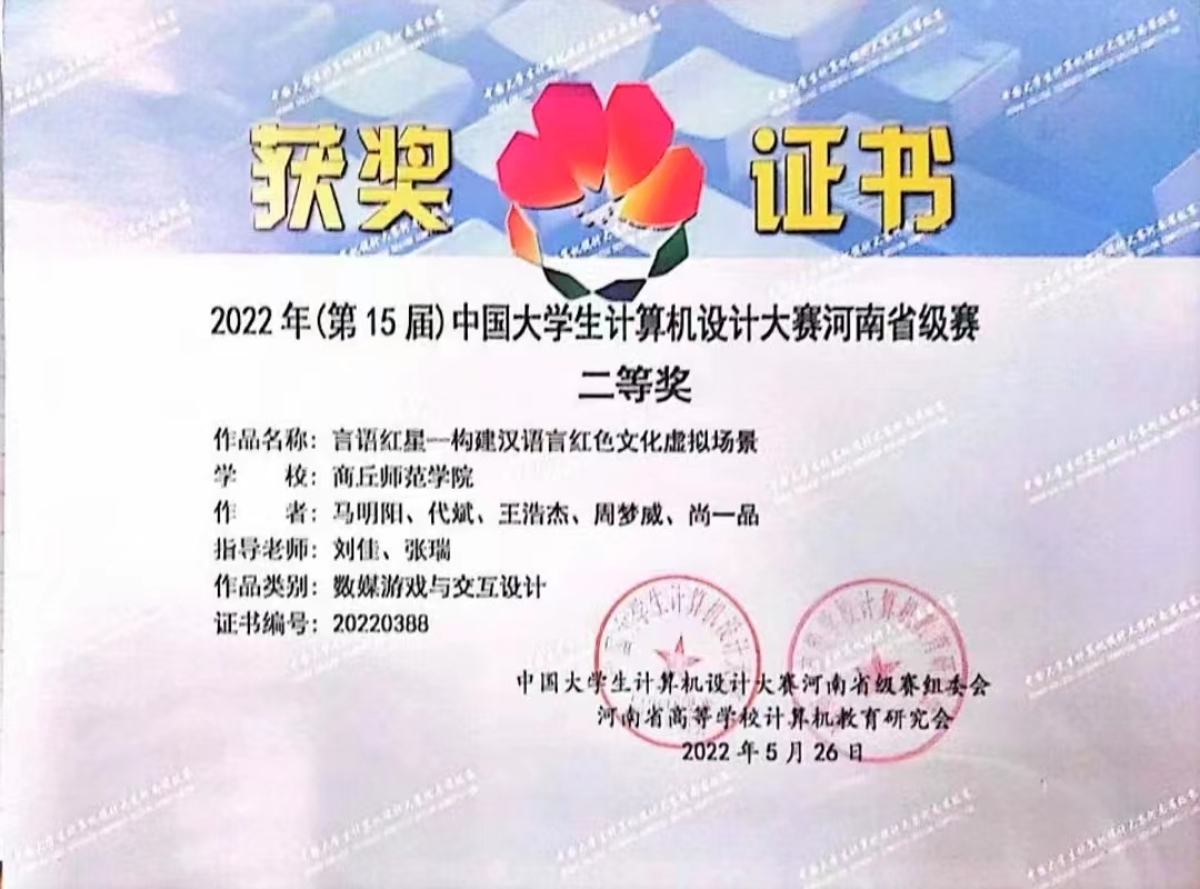 由全国高等学校计算机教育研究会主办,各高校计算机相关院系承办的第十五届中国大学生计算机设计大赛中,万象城学子李炳坤等三名学生荣获人工智能挑战赛类别省赛二等奖; 马明阳等五名学生组成的团队荣获数媒游戏于交互设计类别省赛二等奖。