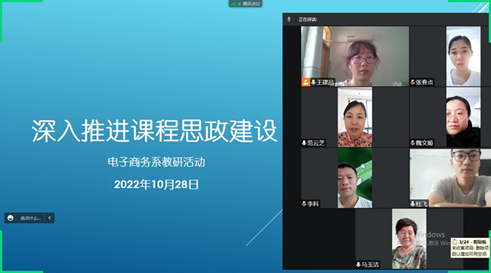 为进一步有效推进课程思政建设工作,10月28日下午,电子商务系全体教师开展了“深入推进课程思政建设”研讨会。本次活动采用腾讯会议在线开展,会议由系主任王建品老师主持。