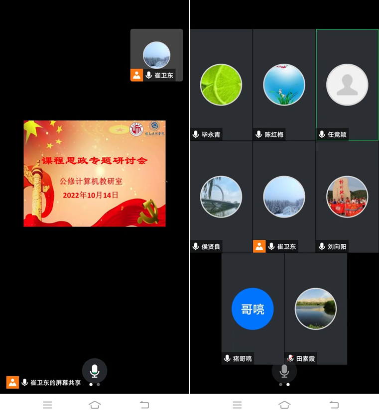 10月14日,公修计算机基础教研室借助腾讯会议举行了课程思政专题研讨会教研活动,全体教研室老师参加了会议。会议由教研室主任崔卫东主持。